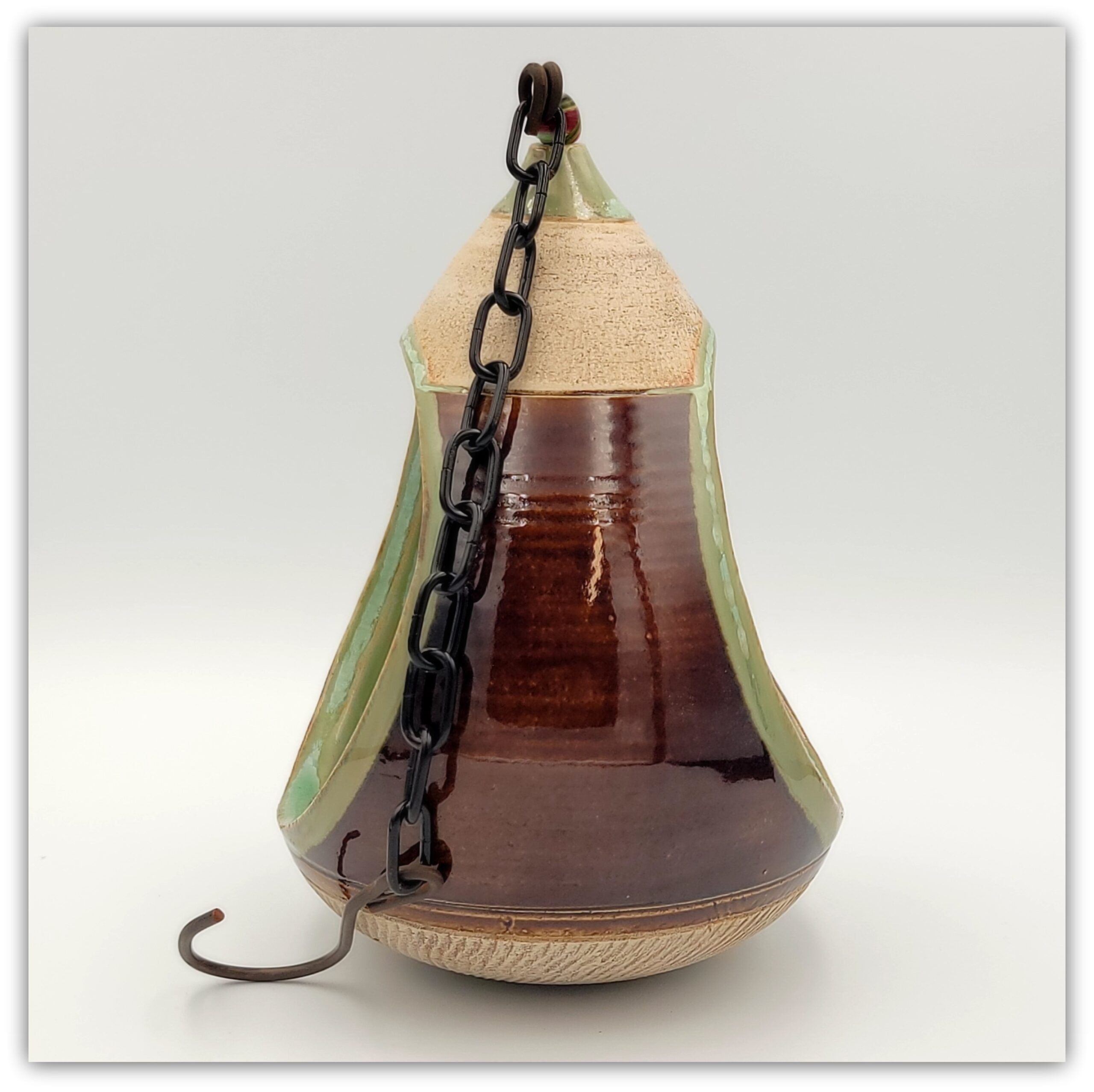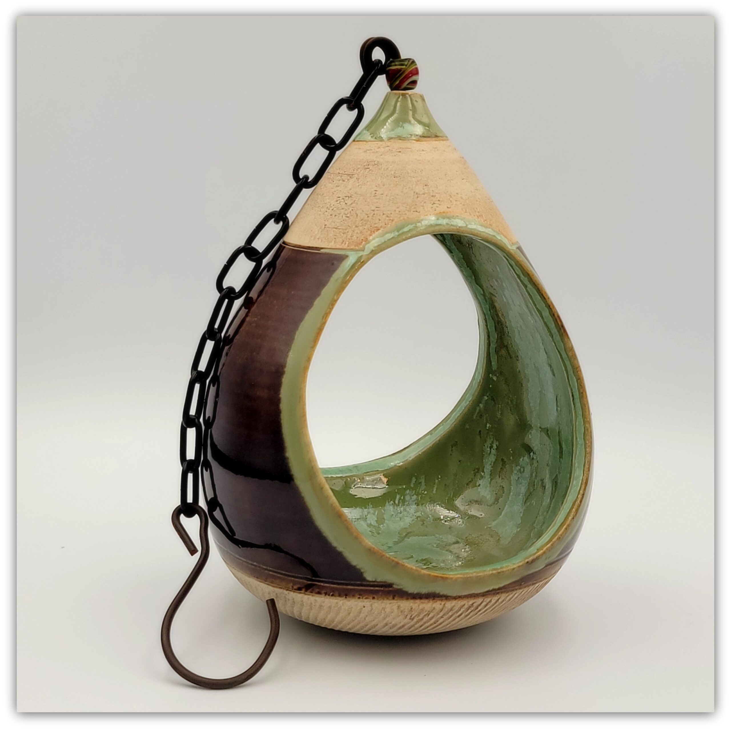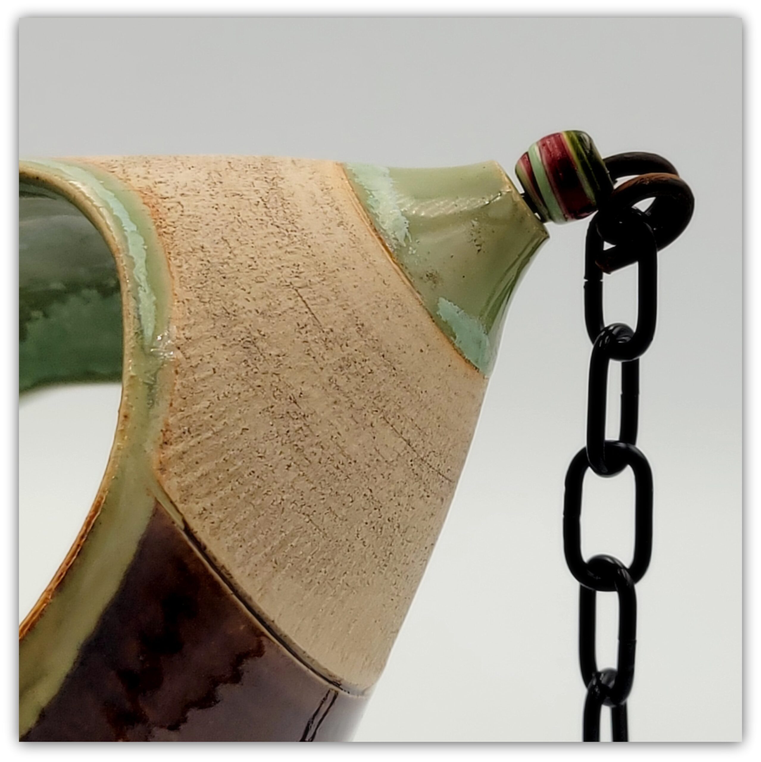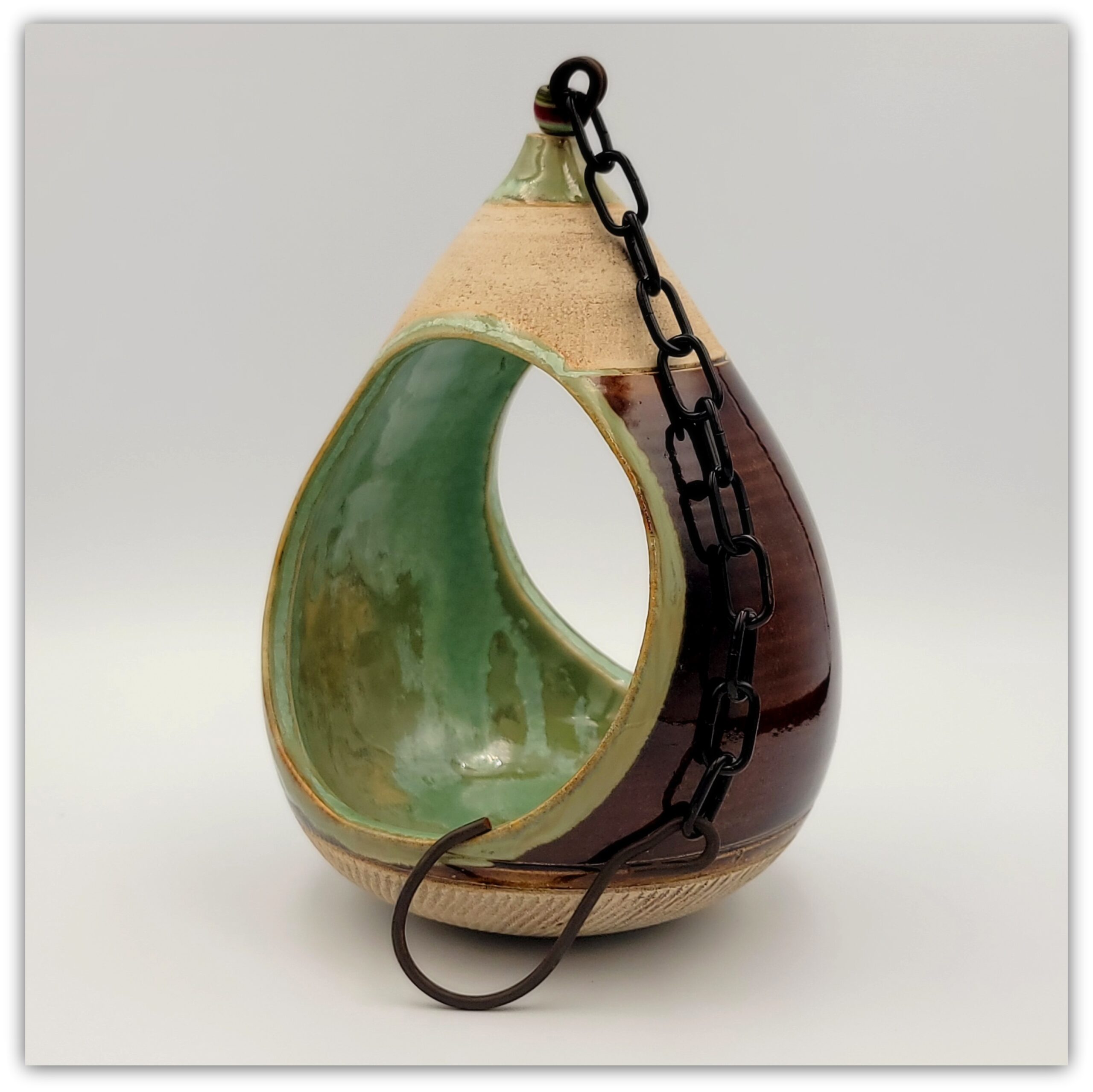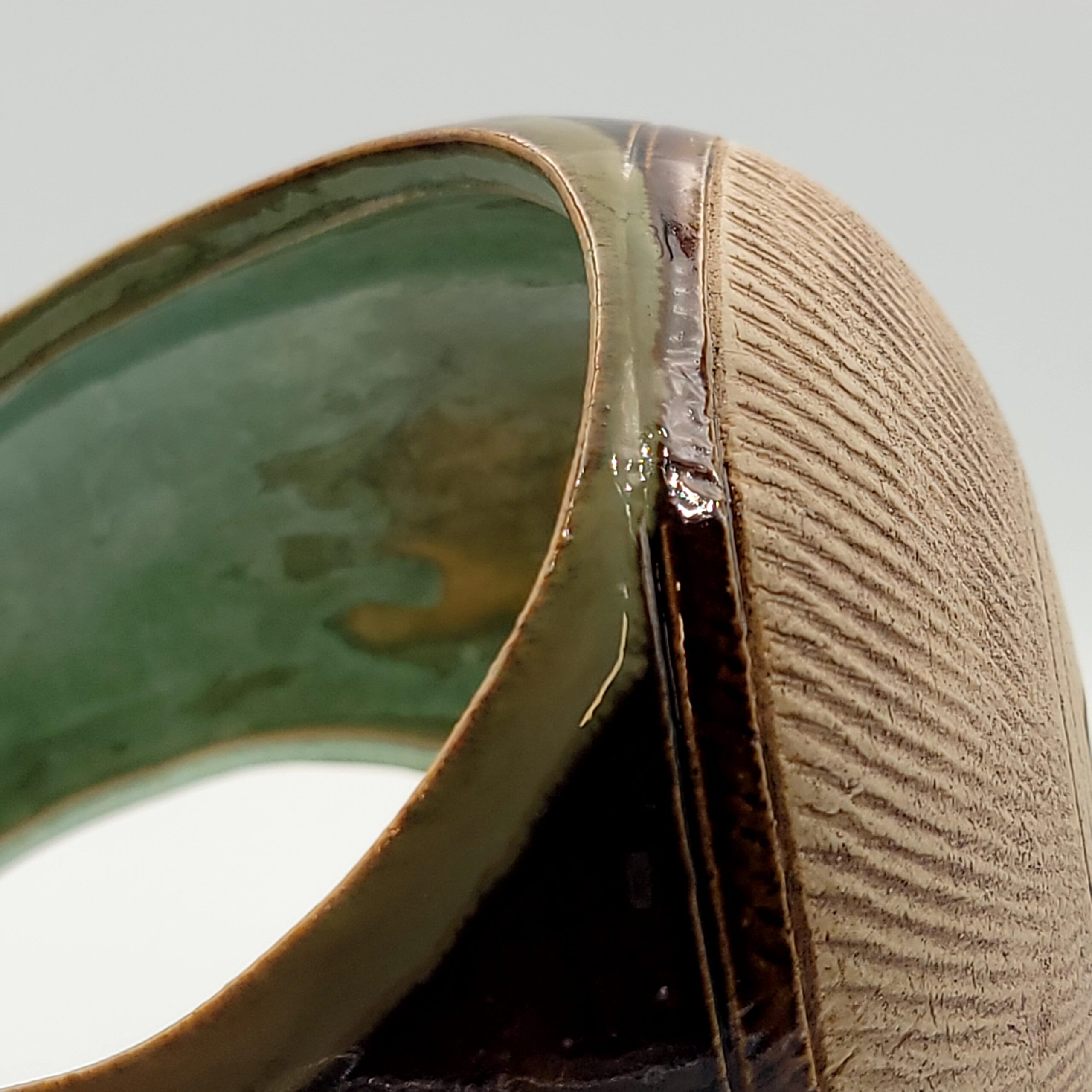 Cream stoneware clay, chattering effect, brown and green glaze outside, biotop green glaze inside,