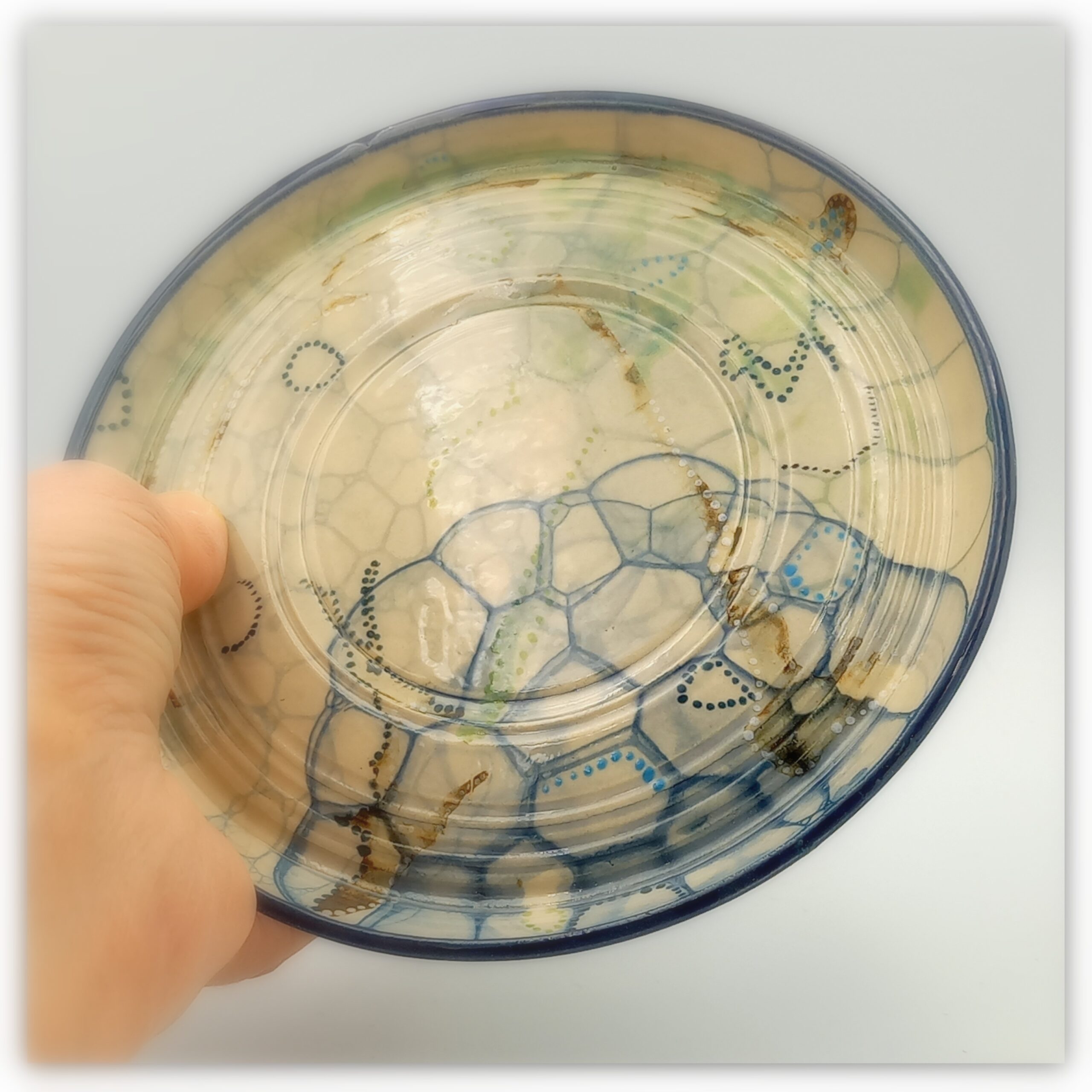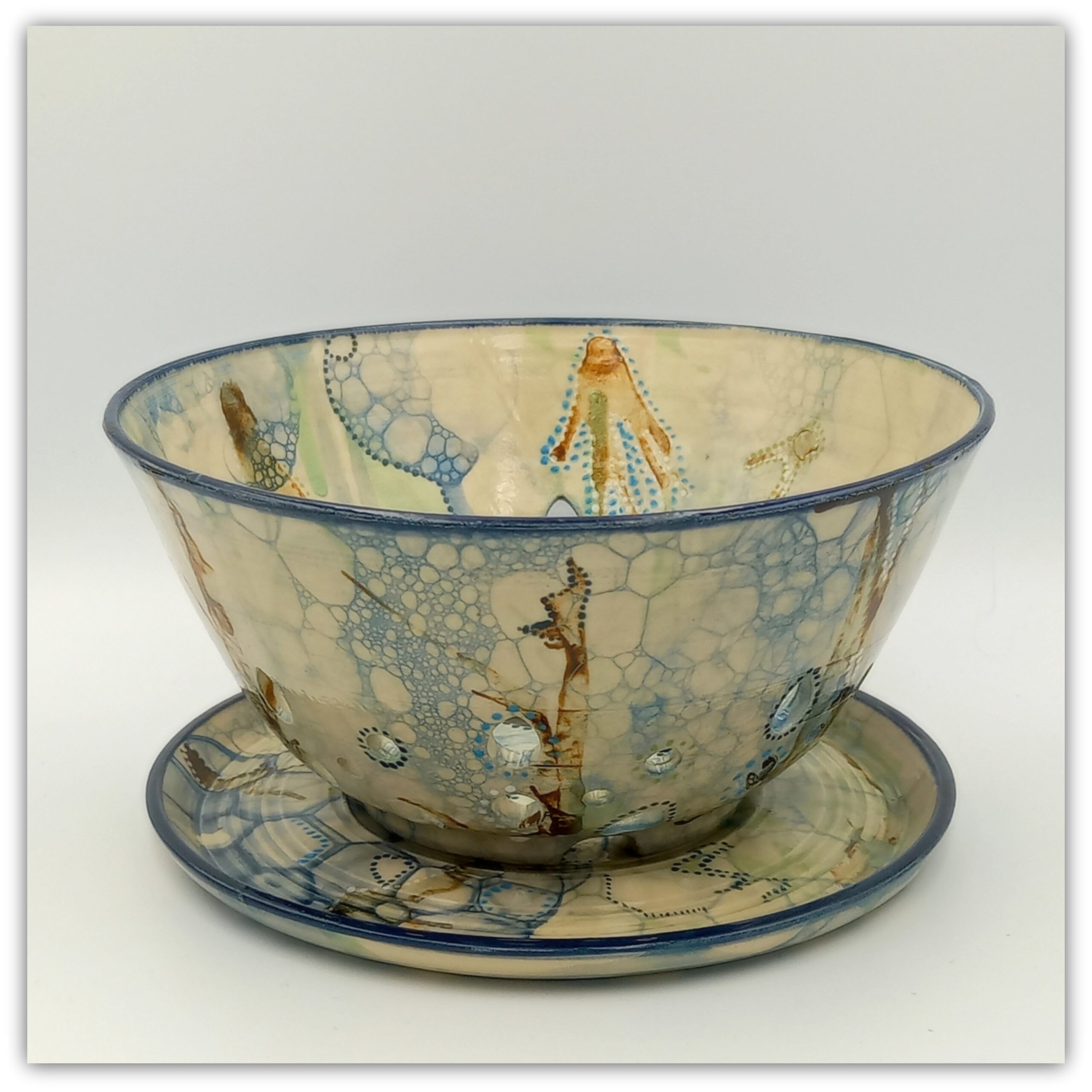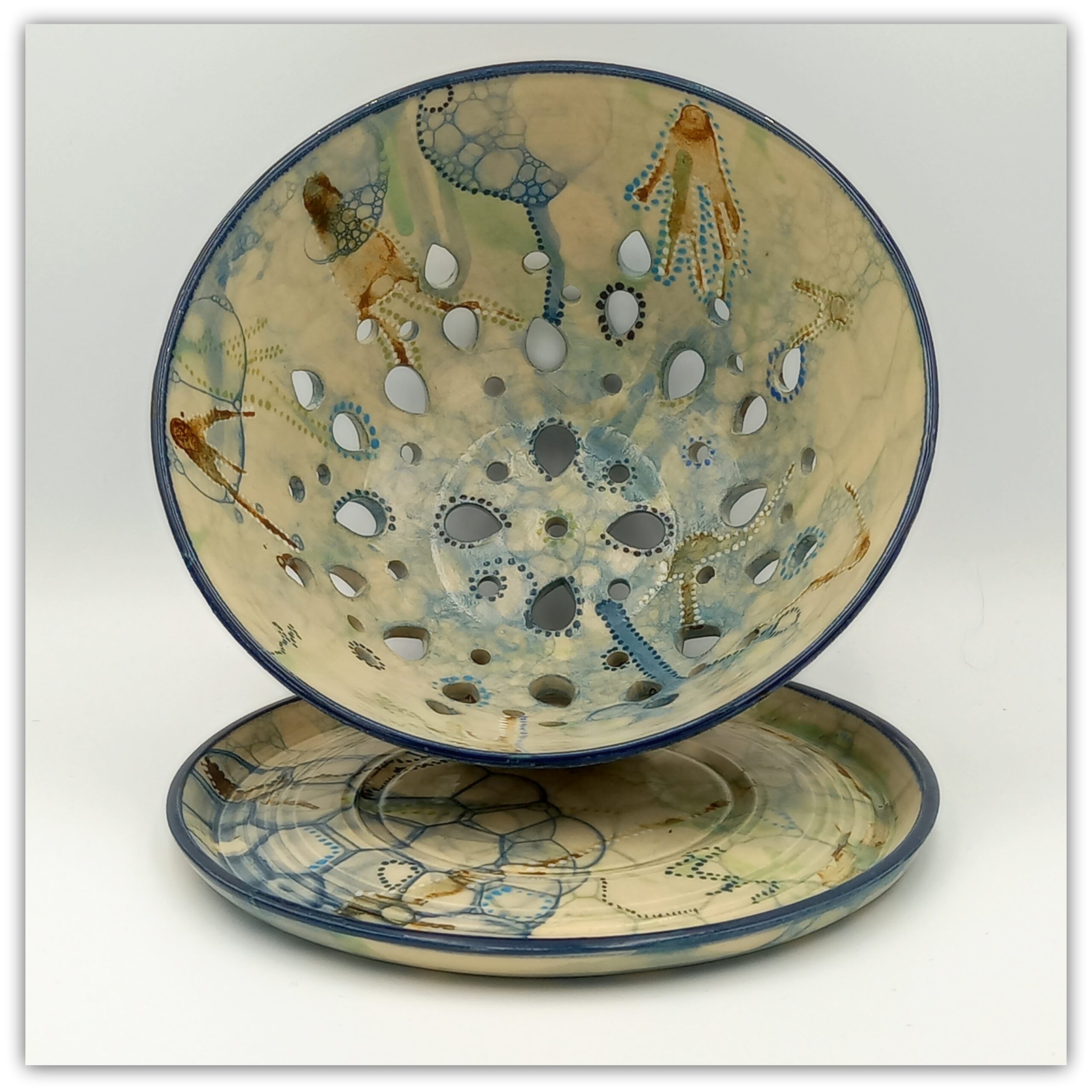 Cream colored stoneware, slip bubbles and varius effects, transparent glaze, holes