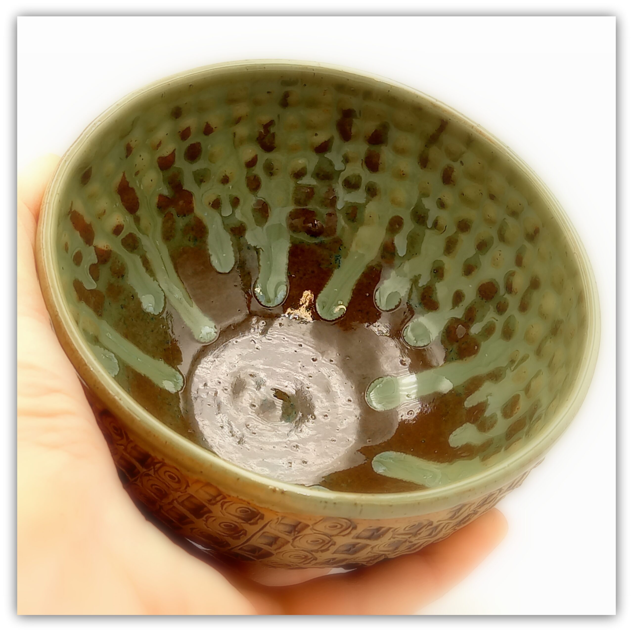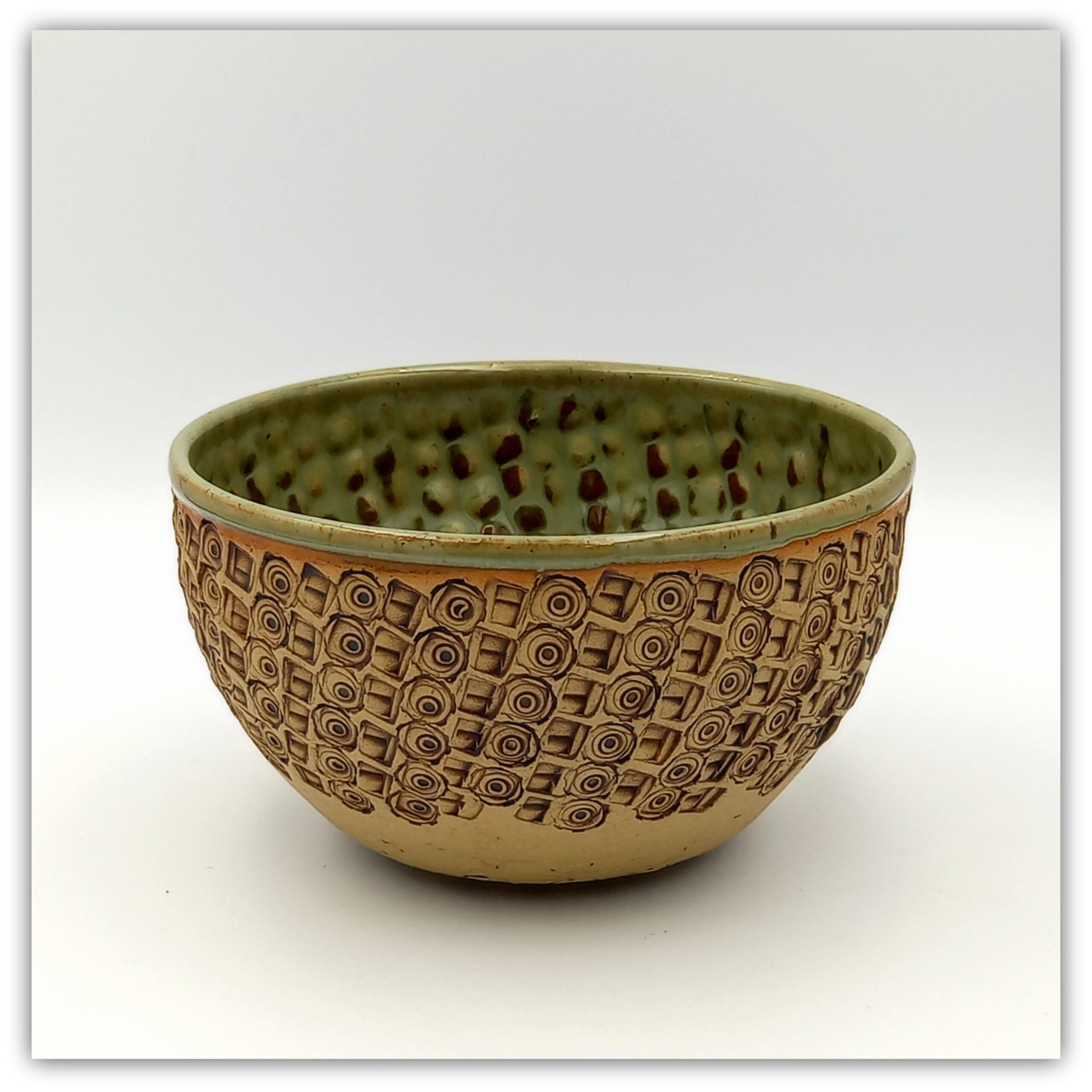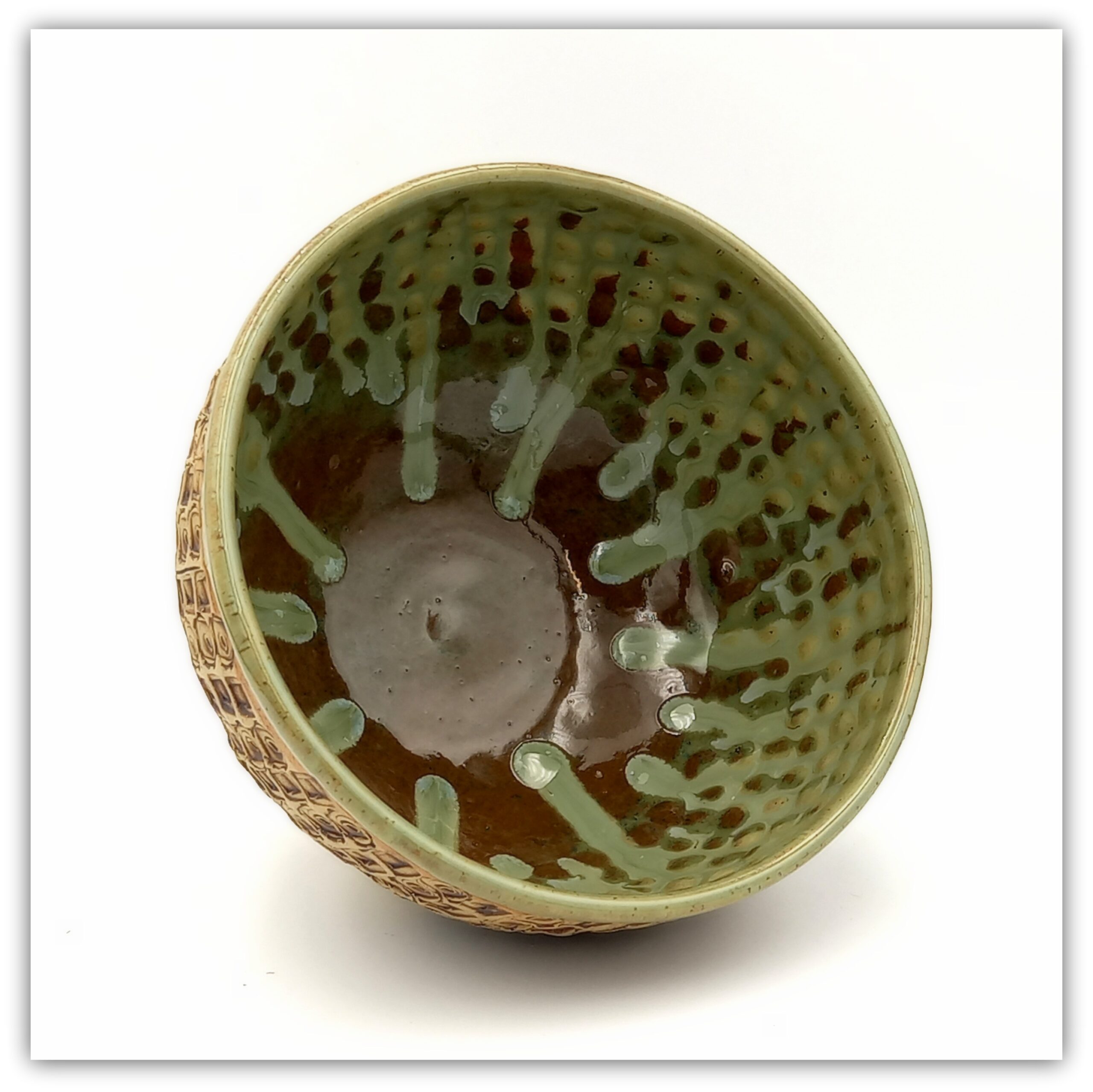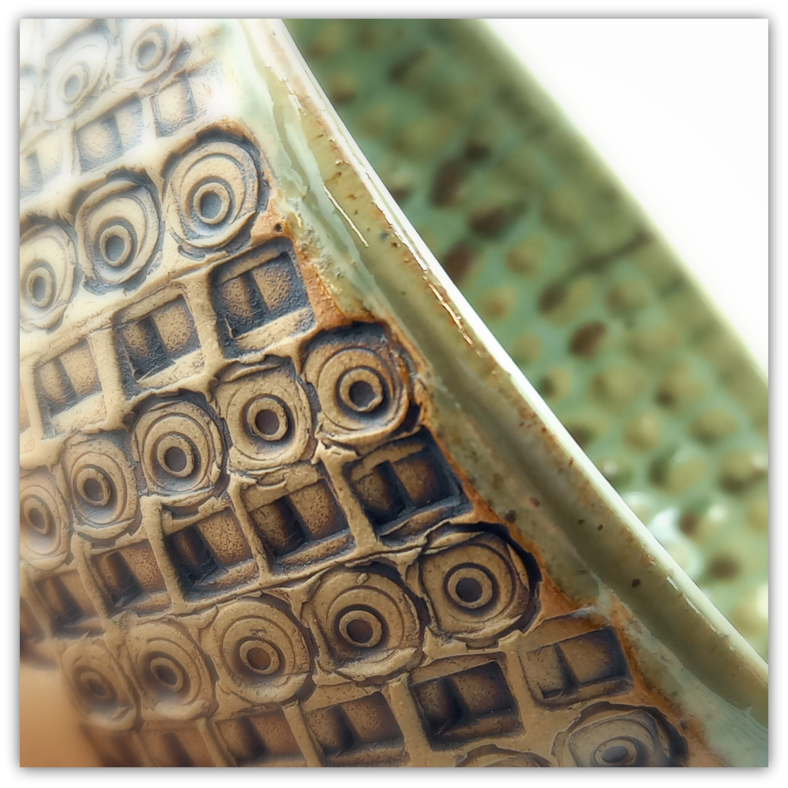 Leather colored stoneware, embossed clay with iron oxide, stone denim and biotop green glaze (inside/rim)