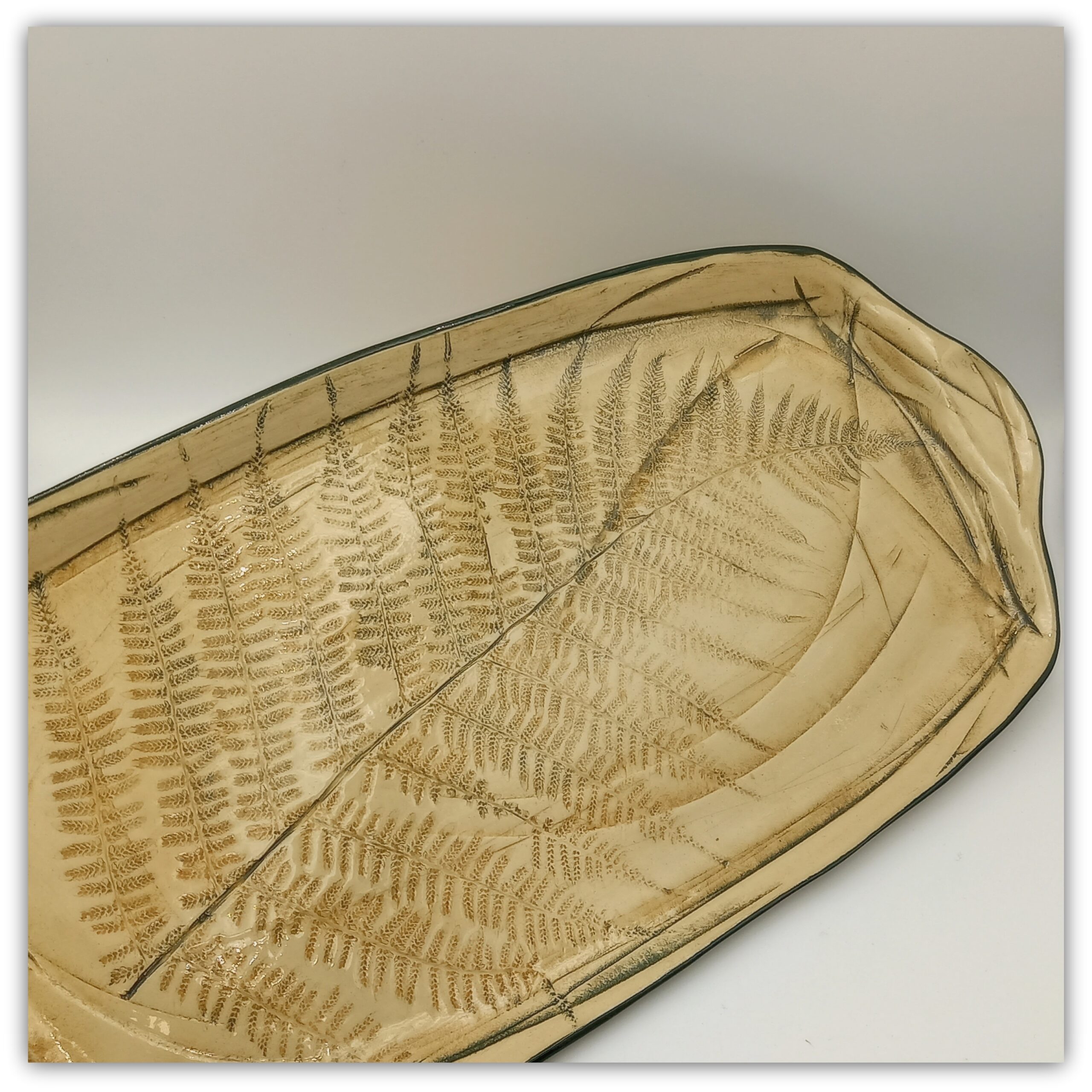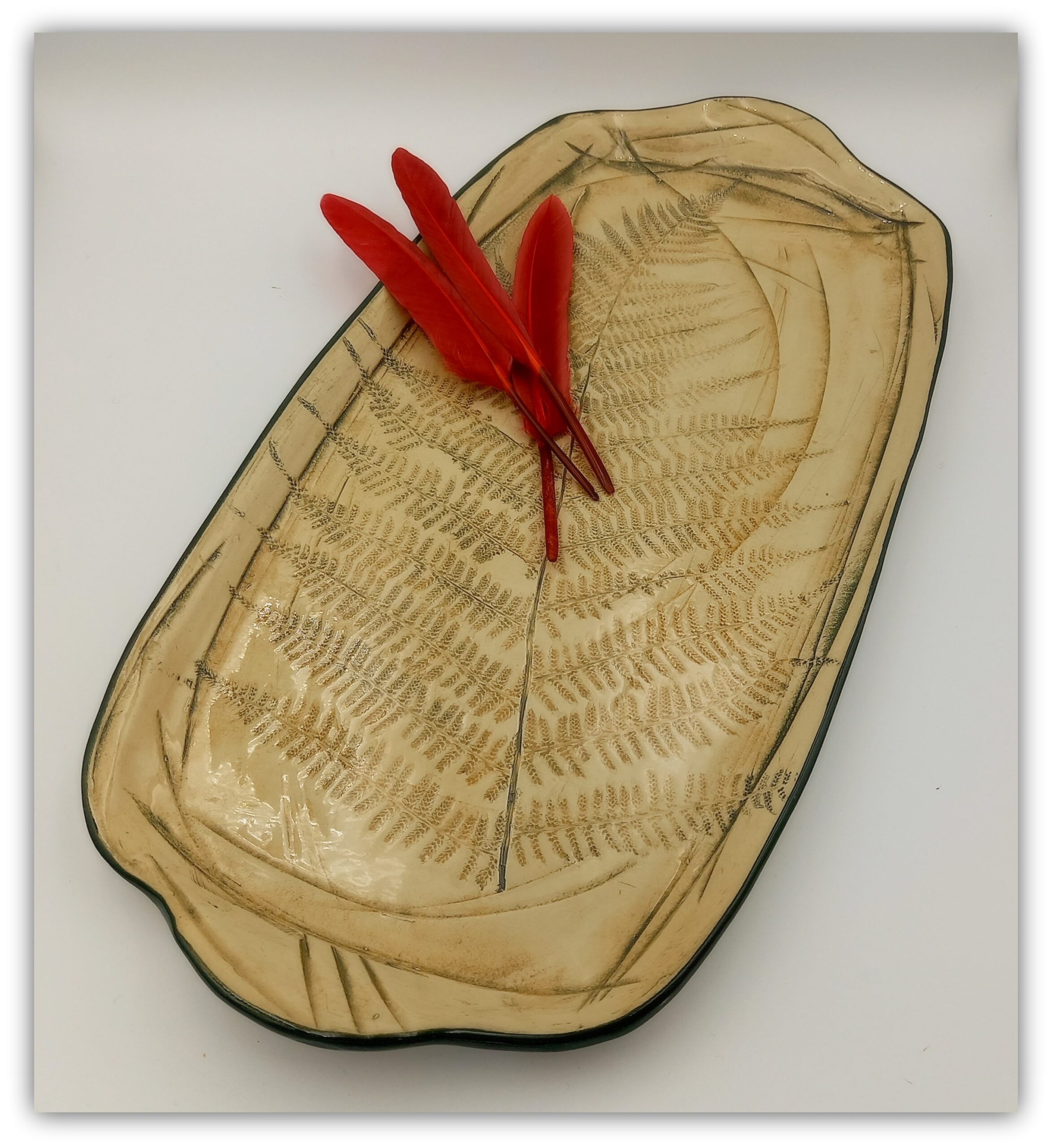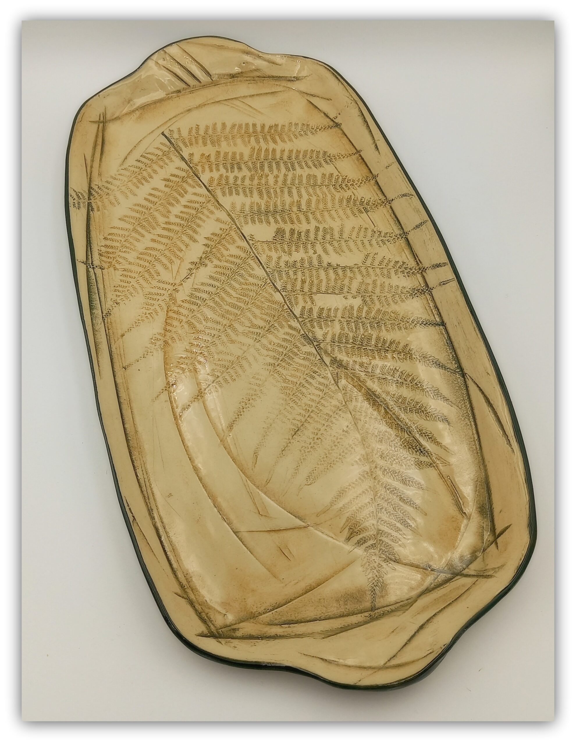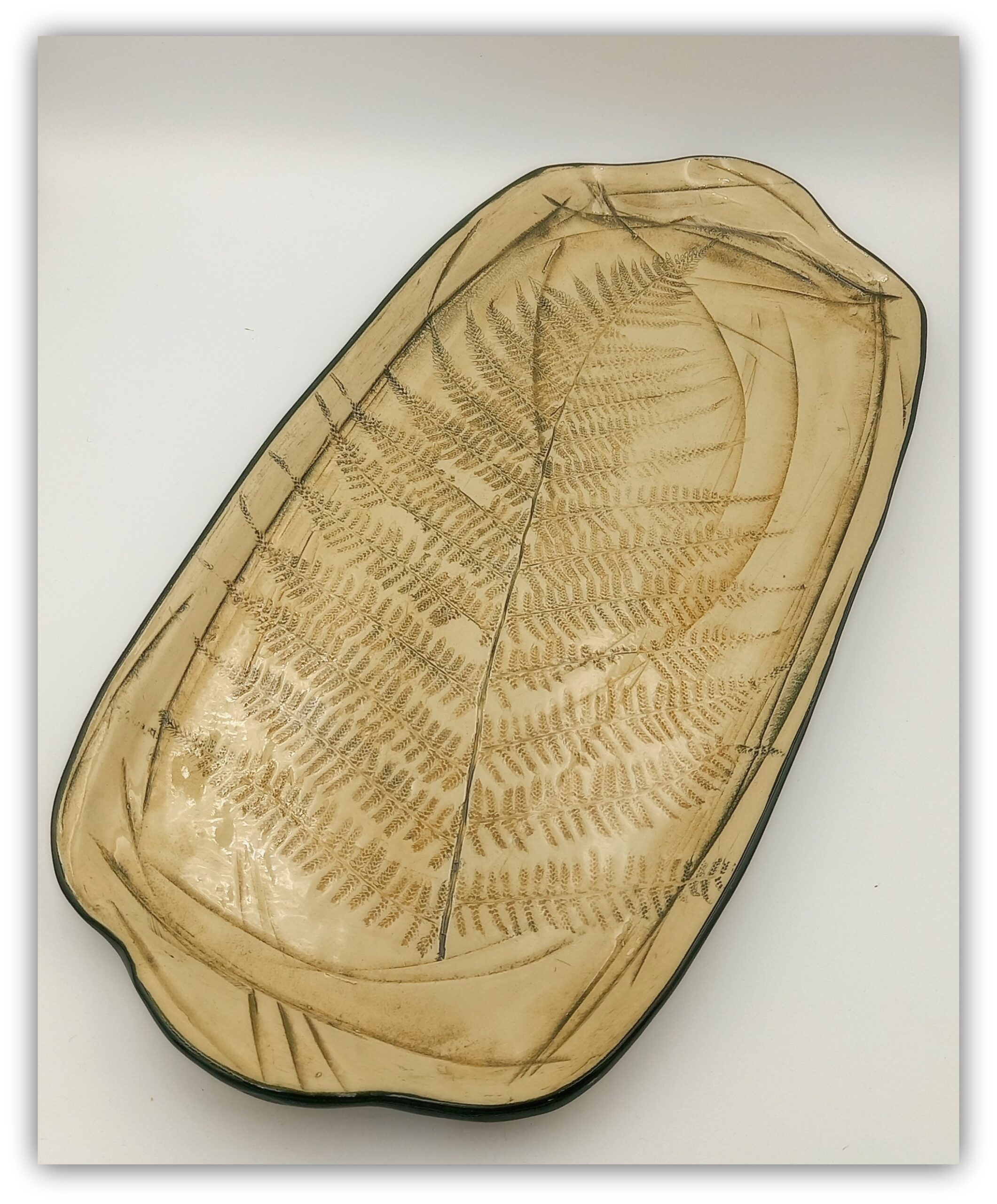 Cream colored stoneware, natural fern print, colored slip (green) and transparent glaze