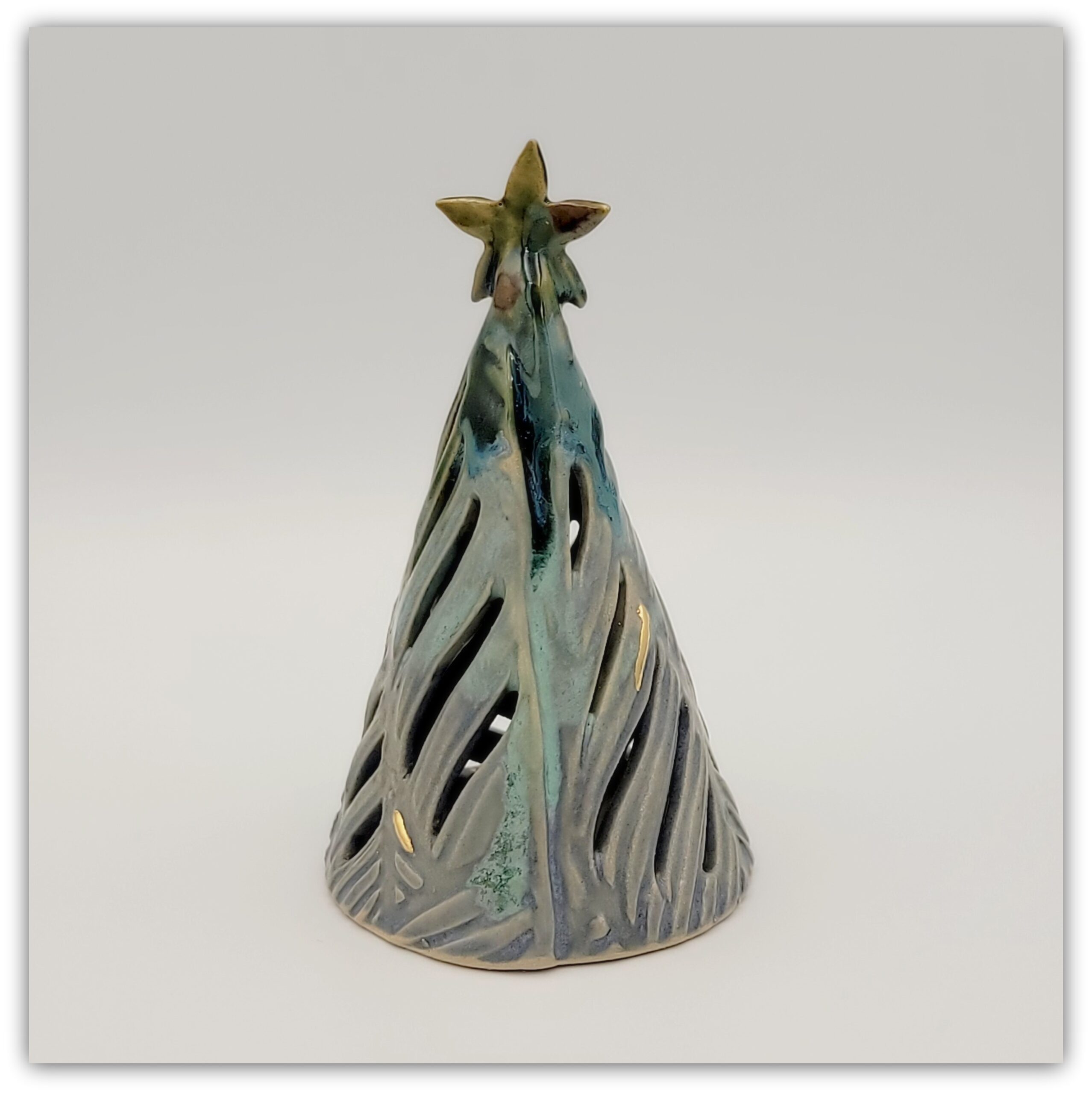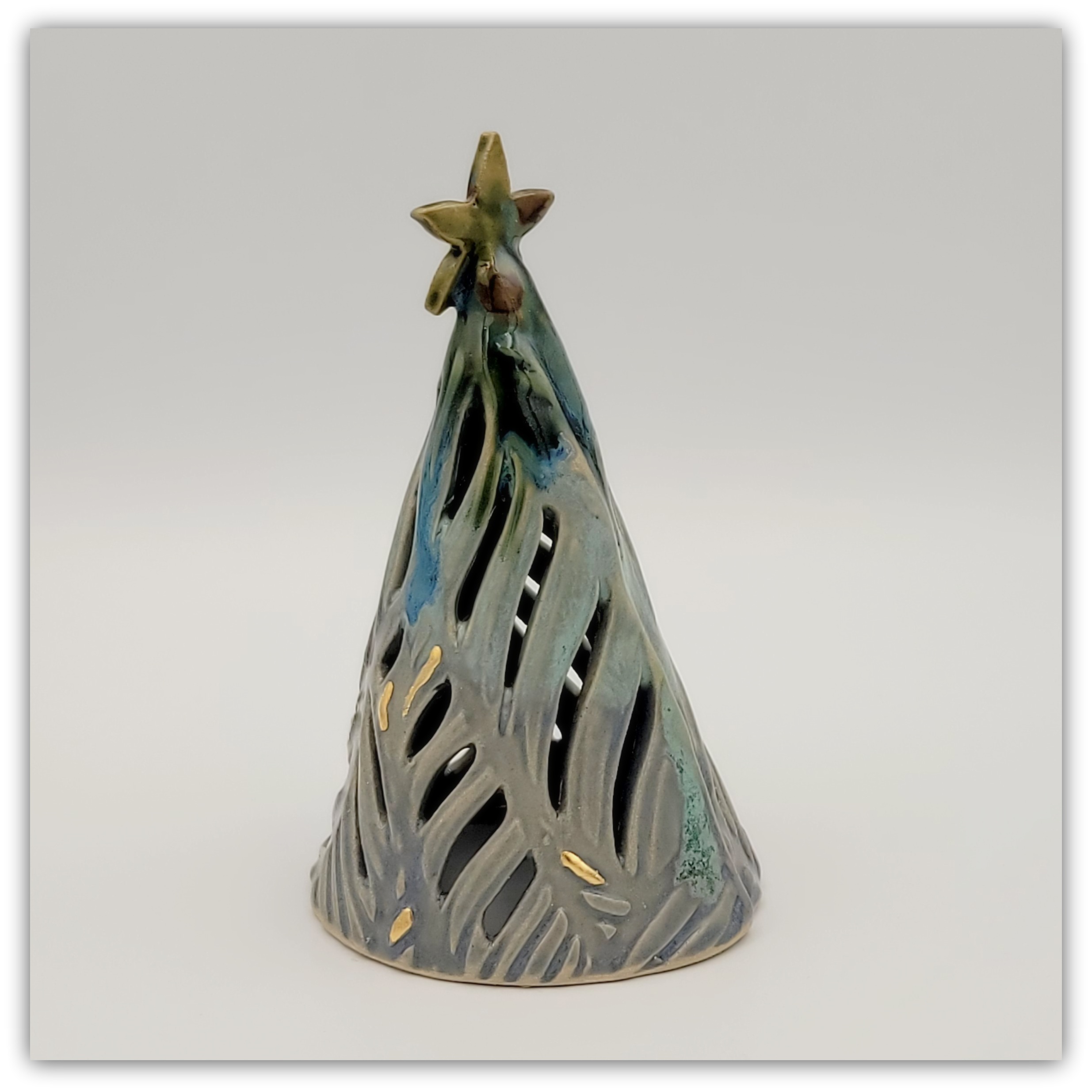 Cream colored stoneware, blue and green glazes , gold leaf decorations