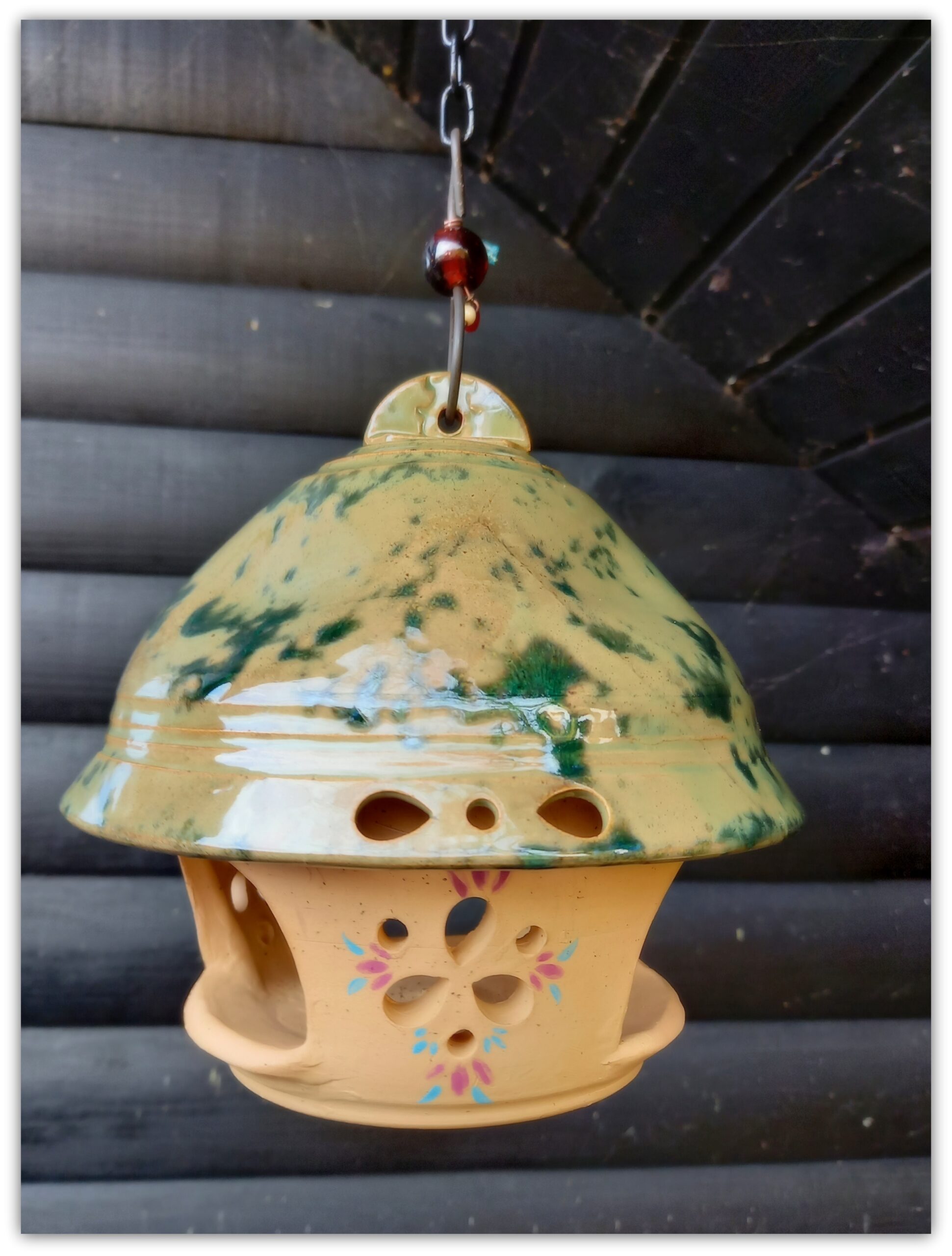 Leather colored clay, slip drowing, holes, green float effect glaze on the top. Chain and hook mounting, beads.