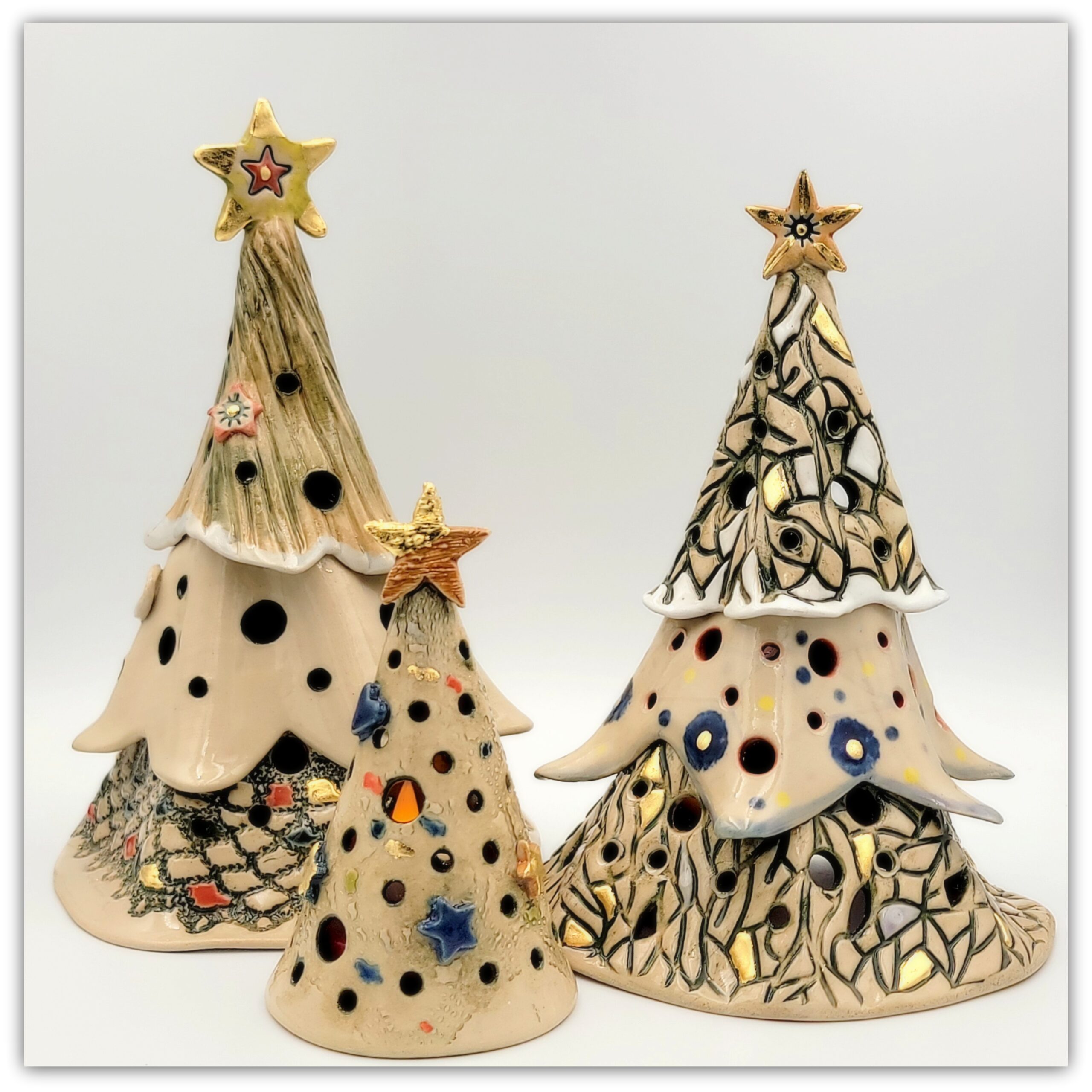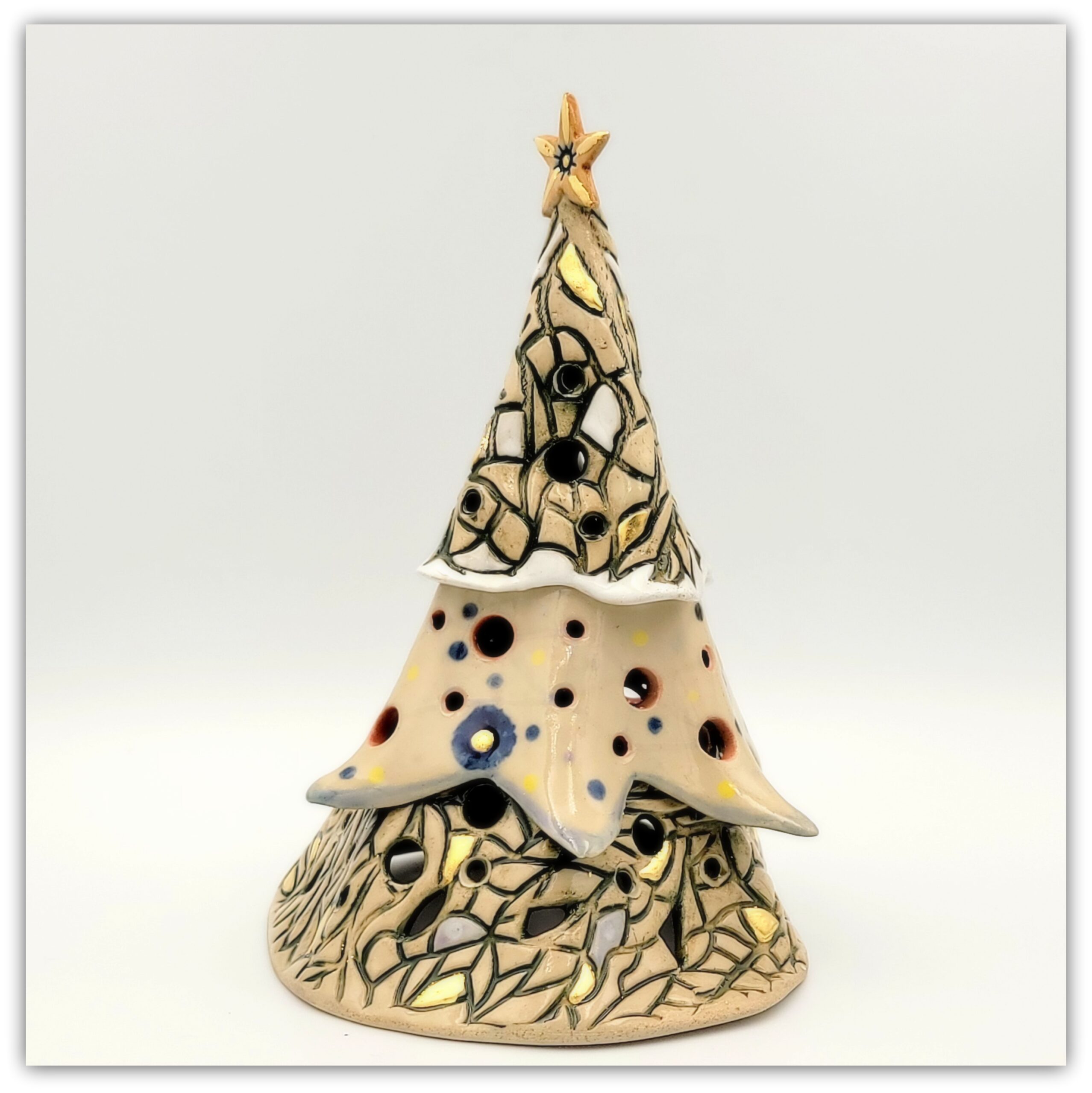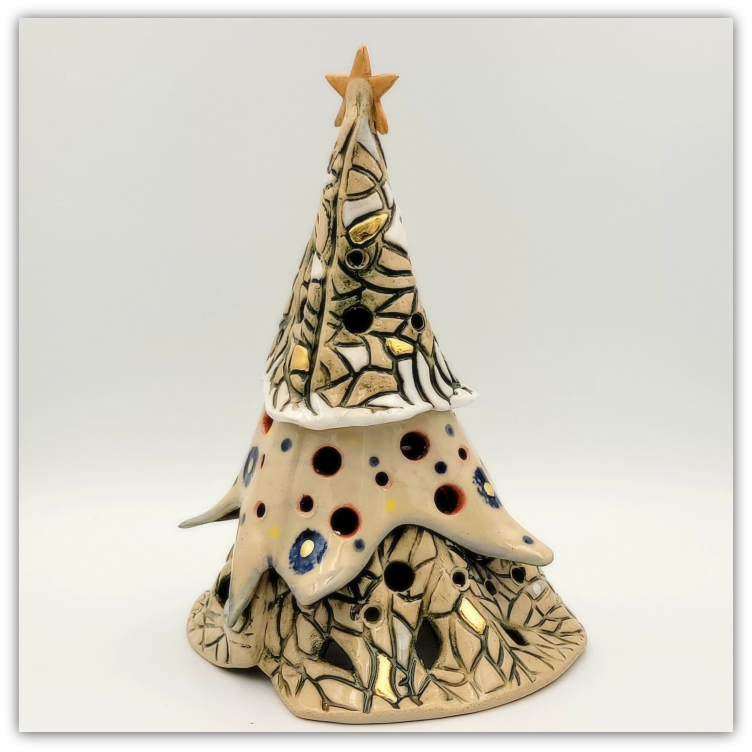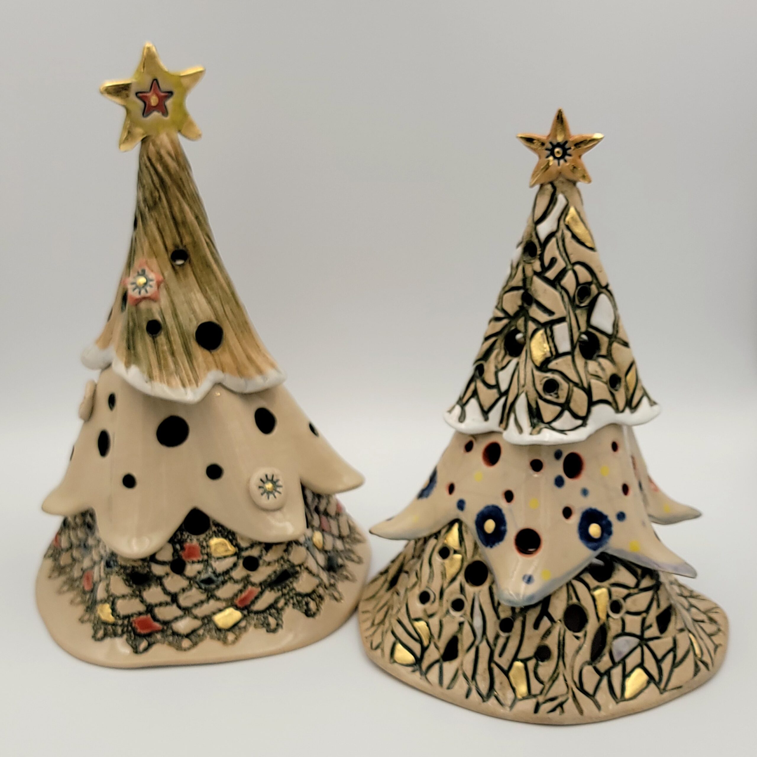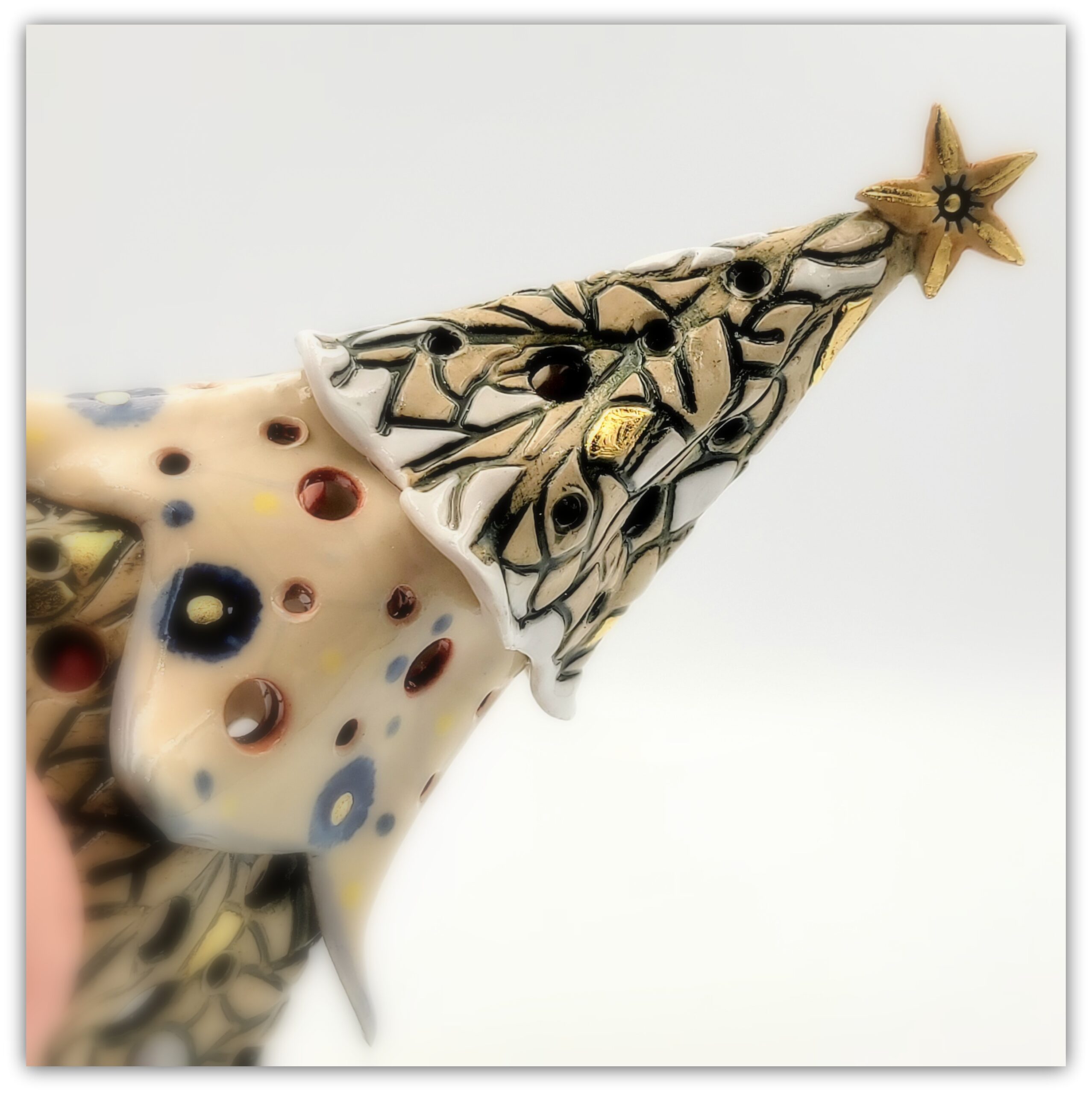 Cream colored stoneware, colored slips, transparent glaze , gold leaf decorations