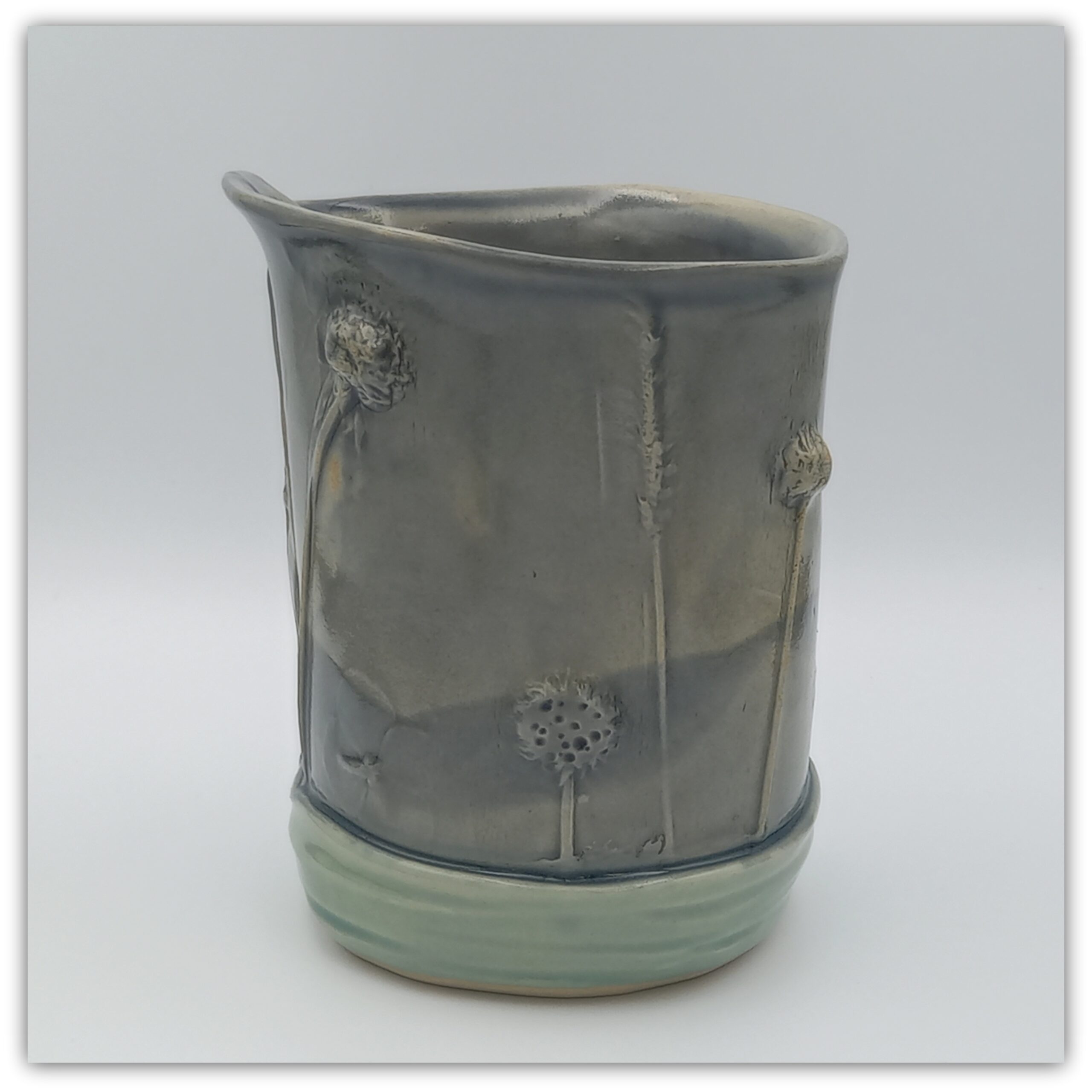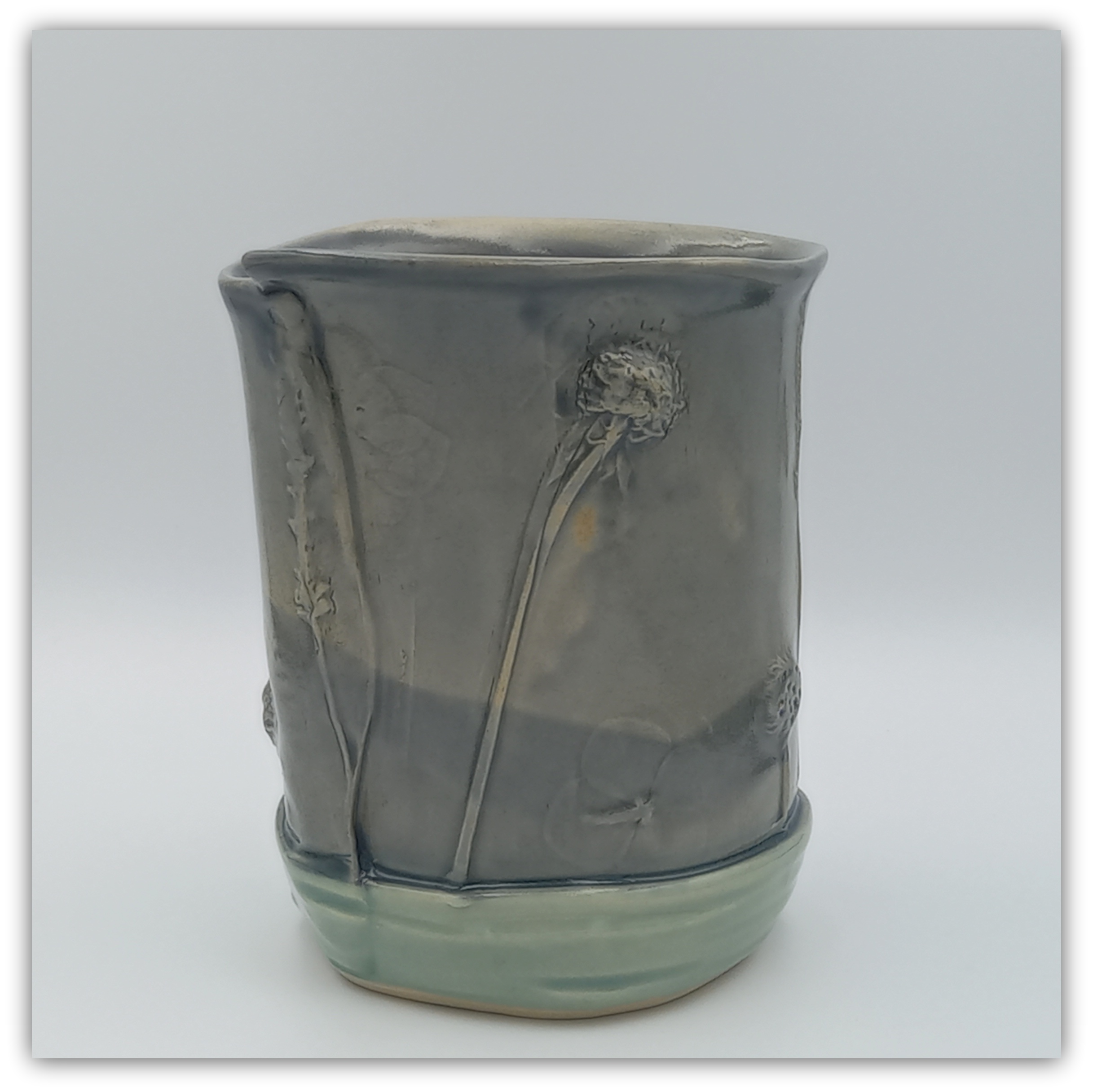 Cream clay, slab built, embossed natural plant print, victoria green glaze on the bottom, blue/gray glaze,